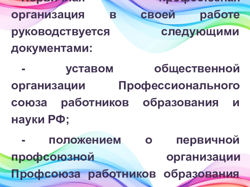 Первичная профсоюзная организация в своей работе руководствуется следующими документами:- уставом общественной организации Профессионального союза работников образования и