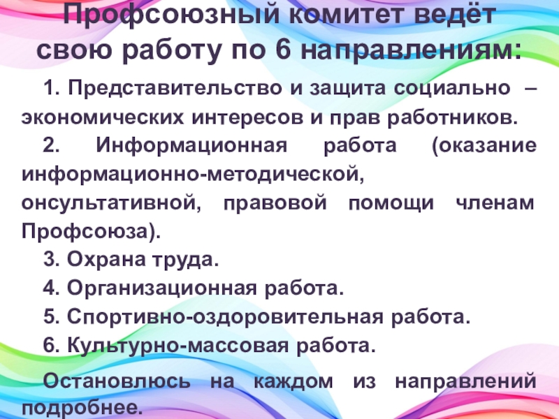 Слайд 5Профсоюзный комитет ведёт свою работу по 6 направлениям: