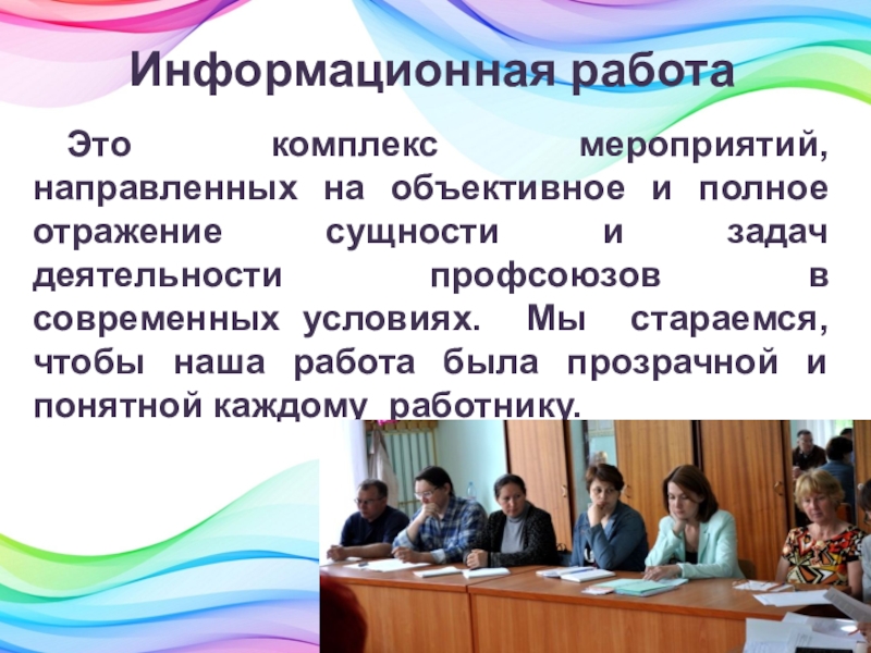 Информационная работаЭто комплекс мероприятий, направленных на объективное и полное отражение сущности и задач деятельности профсоюзов в современных