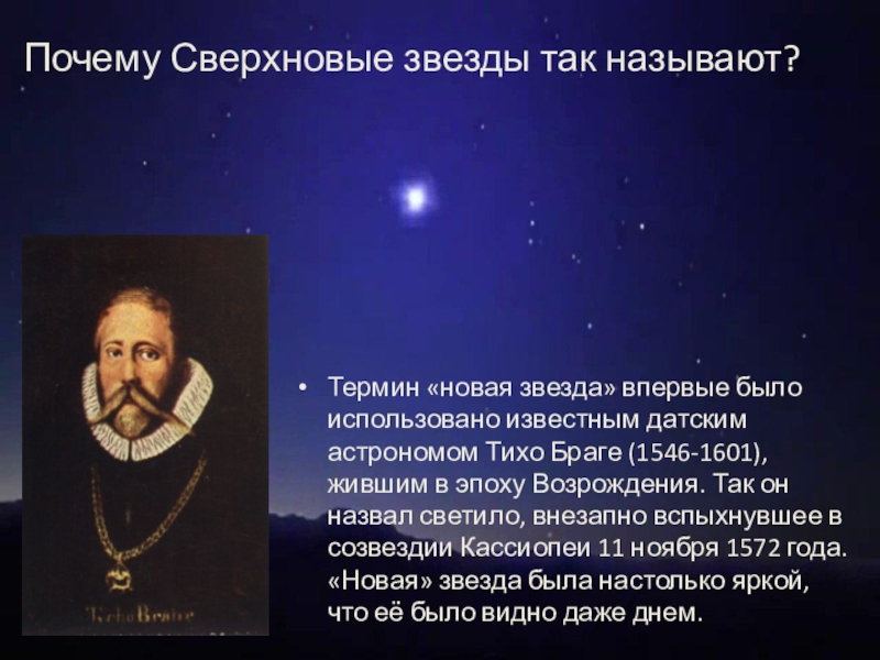 Термин «новая звезда» впервые было использовано известным датским астрономом Тихо Браге (1546-1601), жившим в эпоху Возрождения. Так он назвал светило, внезапно вспыхнувшее в созвездии Кассиопеи 11 ноября 1572 года. «Новая» звезда была настолько яркой, что её было видно даже днем.