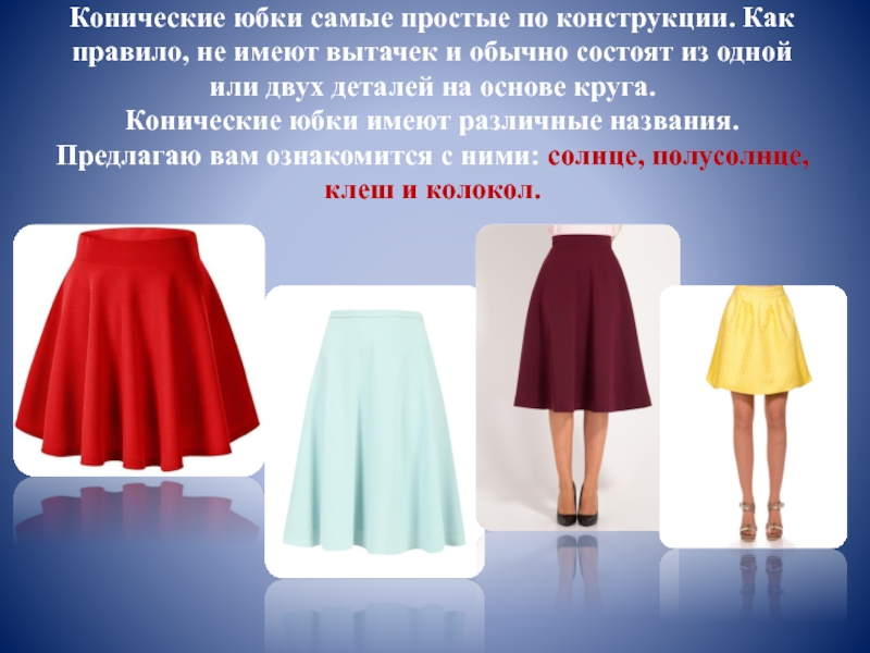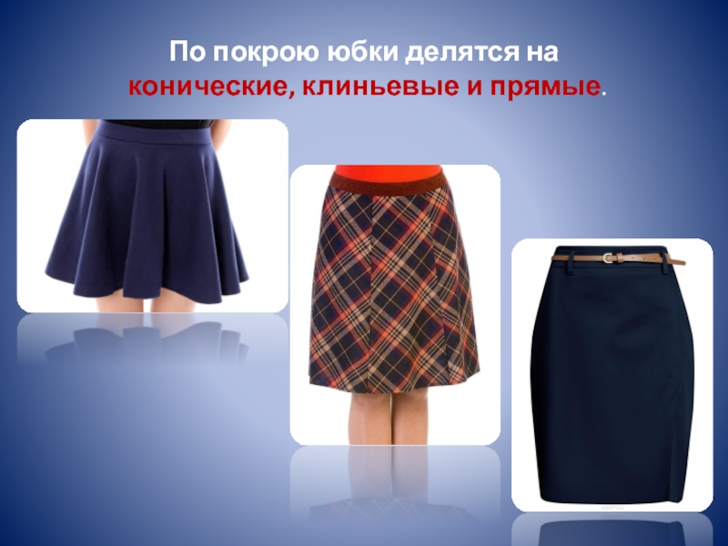 По покрою юбки делятся на  конические, клиньевые и прямые.