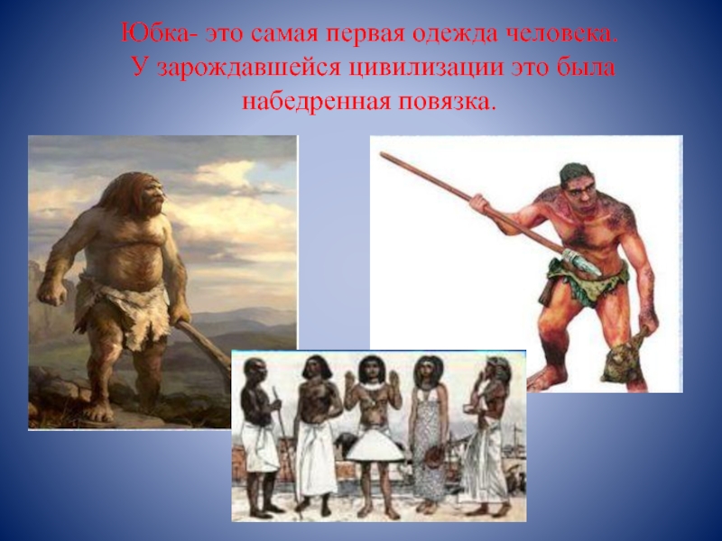Слайд 9Юбка- это самая первая одежда человека. У зарождавшейся цивилизации это была