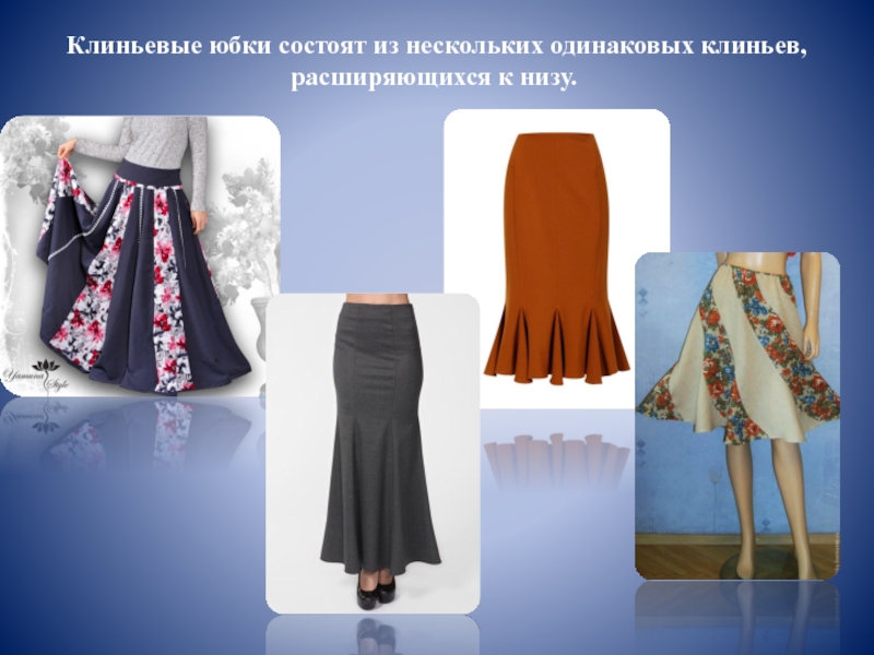 Слайд 16 Клиньевые юбки состоят из нескольких одинаковых клиньев, расширяющихся к низу.