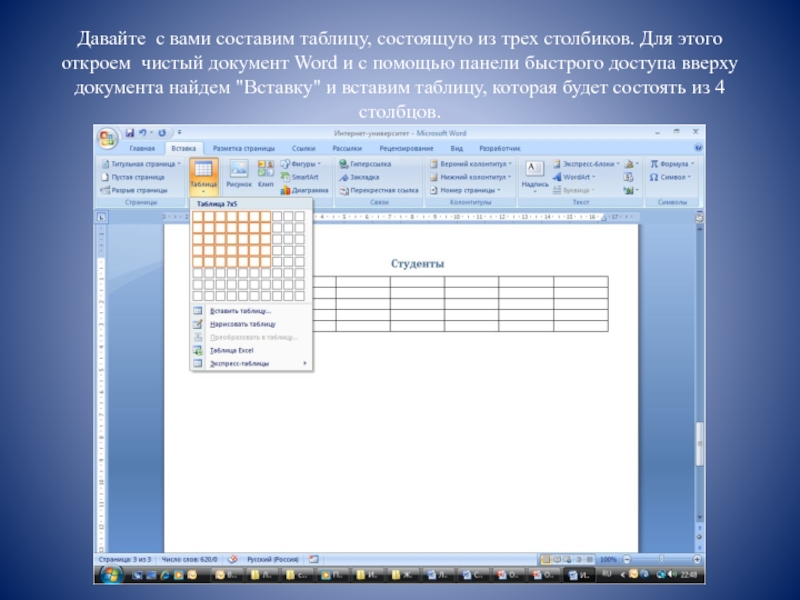 Давайте  с вами составим таблицу, состоящую из трех столбиков. Для этого откроем чистый документ Word и с