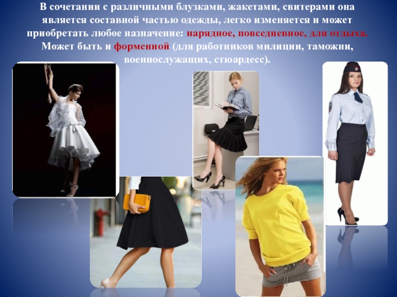 Слайд 12В сочетании с различными блузками, жакетами, свитерами она является составной частью