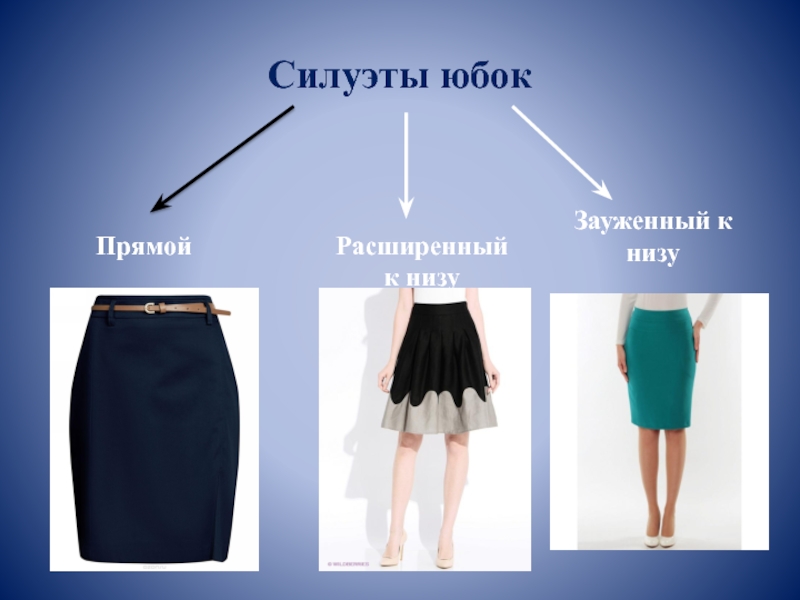 Силуэты юбок ПрямойРасширенный к низуЗауженный к низу