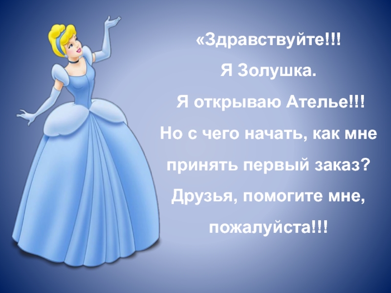 «Здравствуйте!!!Я Золушка. Я открываю Ателье!!! Но с чего начать, как мне принять первый заказ? Друзья, помогите мне,