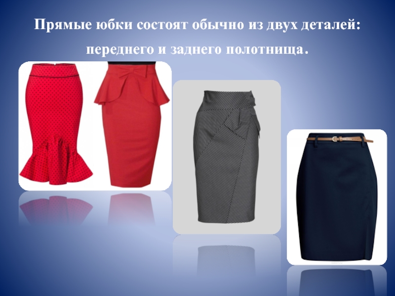 Слайд 17Прямые юбки состоят обычно из двух деталей: переднего и заднего полотнища.