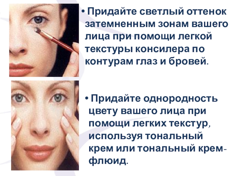 цвету вашего лица при помощи легких текстур, используя тональный крем или тональный крем-флюид.
