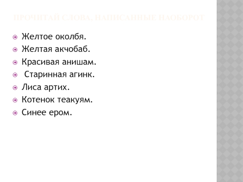 ПРОЧИТАЙ СЛОВА, НАПИСАННЫЕ НАОБОРОТЖелтое околбя. Желтая акчобаб. Красивая анишам. Старинная агинк. Лиса артих. Котенок теакуям. Синее ером.