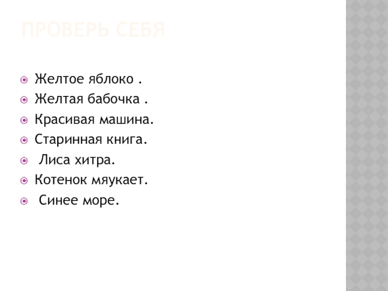 ПРОВЕРЬ СЕБЯЖелтое яблоко . Желтая бабочка . Красивая машина. Старинная книга. Лиса хитра. Котенок мяукает. Синее море.