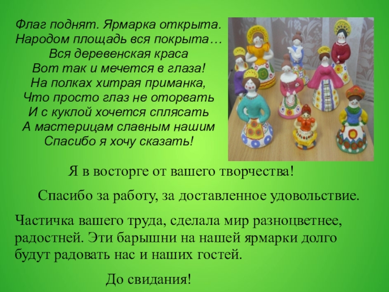Частичка вашего труда, сделала мир разноцветнее, радостней. Эти барышни на нашей ярмарки долго будут радовать нас и наших гостей.