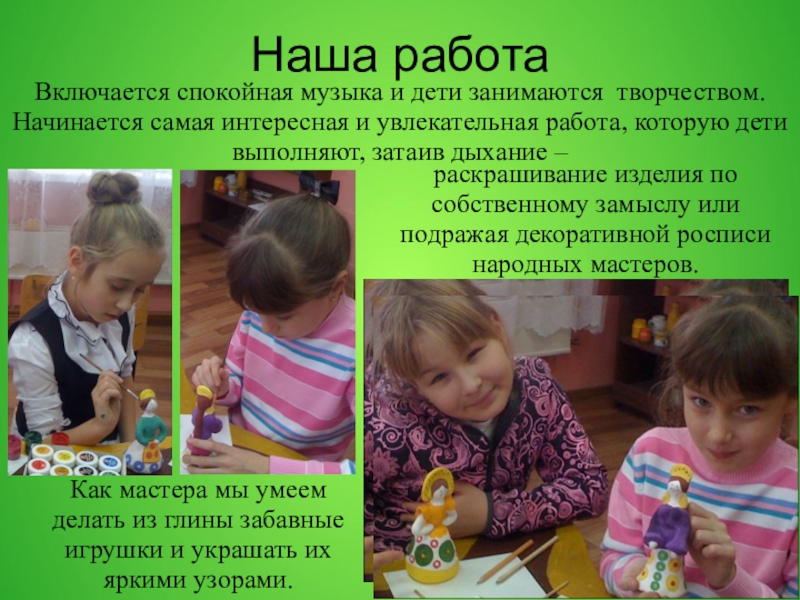 Включается спокойная музыка и дети занимаются творчеством. Начинается самая интересная и увлекательная работа, которую дети выполняют, затаив дыхание –