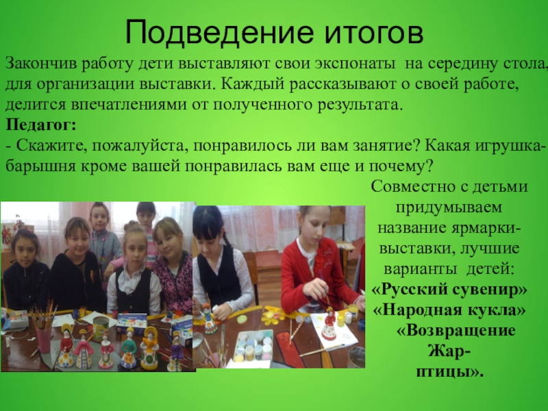 Закончив работу дети выставляют свои экспонаты на середину стола, для организации выставки. Каждый рассказывают о своей работе, делится впечатлениями от полученного результата.