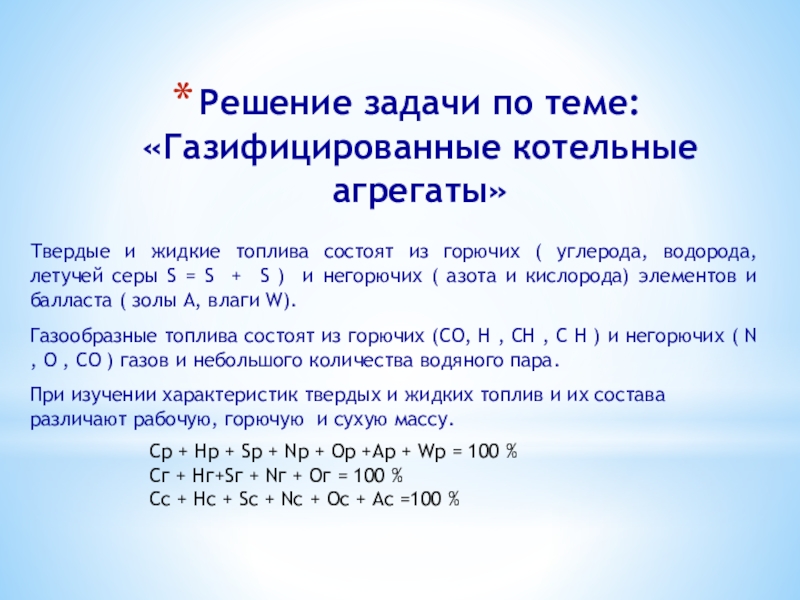 При изучении характеристик твердых и жидких топлив и их состава различают рабочую, горючую и сухую массу.