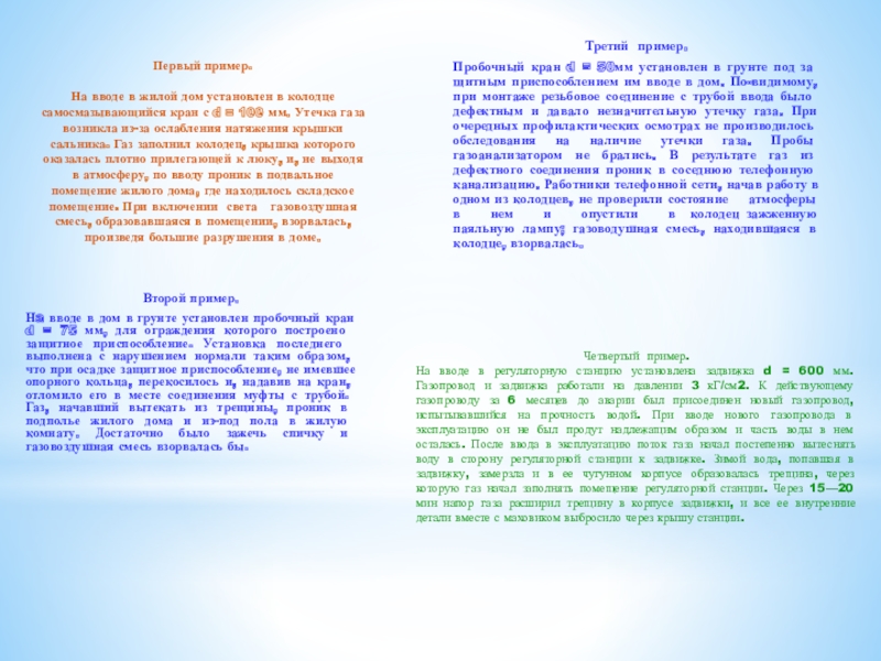 Нa вводе в дом в грунте установлен пробочный кран d = 75 мм, для ограждения которого построено защитное приспособление. Установка последнего выполнена с нарушением нормали таким образом, что при осадке защитное приспособление, не имевшее опорного кольца, перекосилось и, надавив на кран, отломило его в месте соединения муфты с трубой. Газ, начавший вытекать из трещины, проник в подполье жилого дома и из-под пола в жилую комнату. Достаточно было зажечь спичку и газовоздушная смесь взорвалась бы.