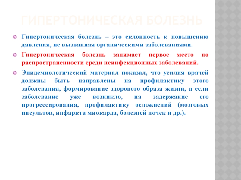 Гипертоническая болезнь занимает первое место по распространенности среди неинфекционных заболеваний.