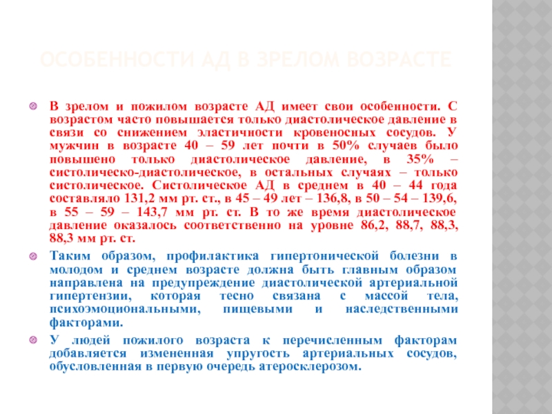 свои особенности. С возрастом часто повышается только диастолическое давление в связи со снижением эластичности кровеносных сосудов. У мужчин в возрасте 40 – 59 лет почти в 50% случаев было повышено только диастолическое давление, в 35% – систолическо-диастолическое, в остальных случаях – только систолическое. Систолическое АД в среднем в 40 – 44 года составляло 131,2 мм рт. ст., в 45 – 49 лет – 136,8, в 50 – 54 – 139,6, в 55 – 59 – 143,7 мм рт. ст. В то же время диастолическое давление оказалось соответственно на уровне 86,2, 88,7, 88,3, 88,3 мм рт. ст.