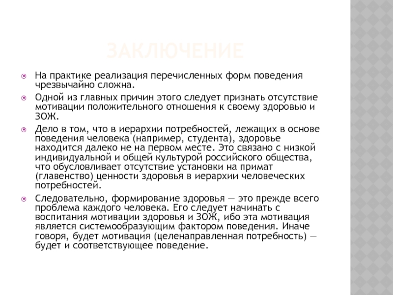 причин этого следует признать отсутствие мотивации положительного отношения к своему здоровью и ЗОЖ.