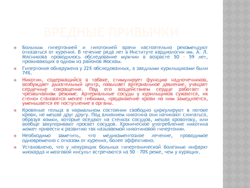 Установлено, что у некурящих больных гипертонической болезнью инфаркт миокарда и мозговой инсульт встречаются на 50 – 70% реже, чем у курящих.