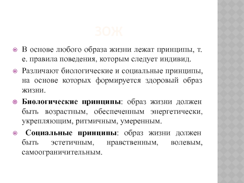 Различают биологические и социальные принципы, на основе которых формируется здоровый образ жизни.