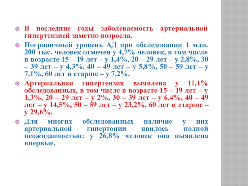 Слайд 6В последние годы заболеваемость артериальной гипертензией заметно возросла.