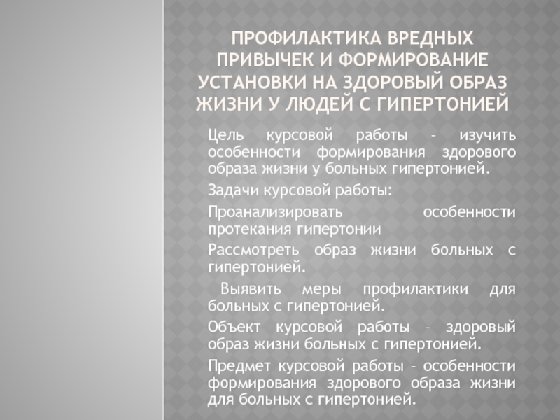 Цель курсовой работы – изучить особенности формирования здорового образа жизни у больных гипертонией.