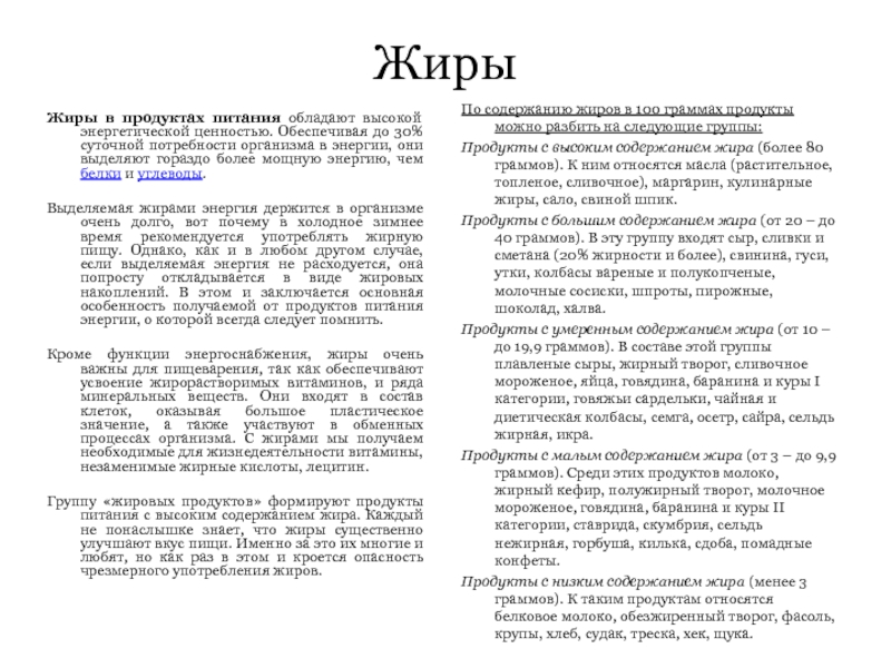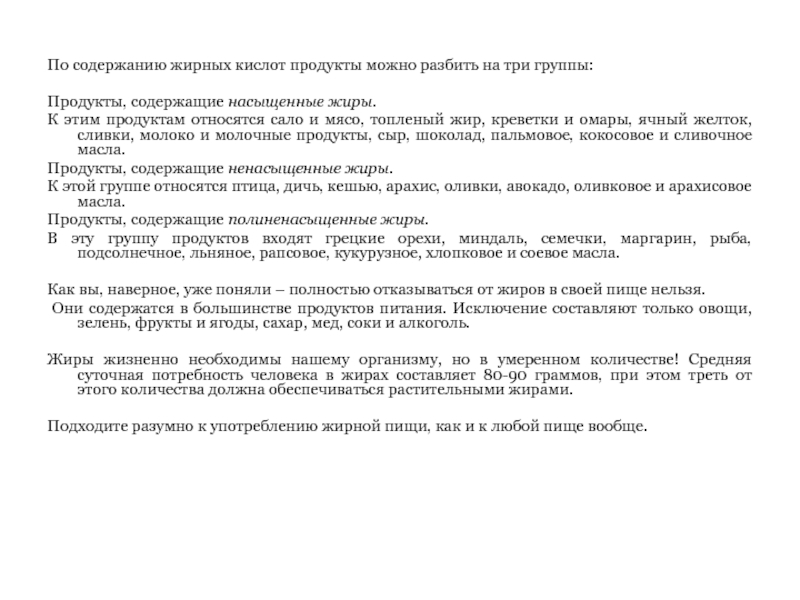 По содержанию жиров в 100 граммах продукты можно разбить на следующие группы: