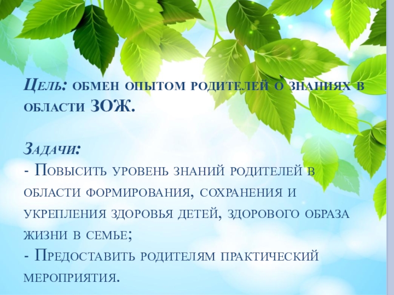 Цель: обмен опытом родителей о знаниях в области ЗОЖ. Задачи: - Повысить уровень знаний родителей в области формирования, сохранения и укрепления здоровья детей, здорового образа жизни в семье; - Предоставить родителям практический мероприятия.