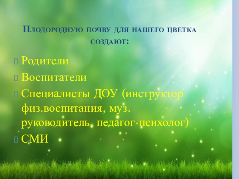Плодородную почву для нашего цветка создают: РодителиВоспитателиСпециалисты ДОУ (инструктор физ.воспитания, муз. руководитель, педагог-психолог)СМИ