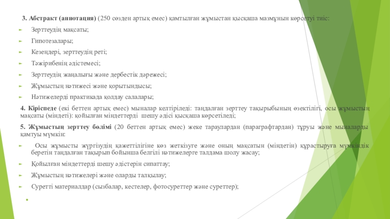 3. Абстракт (аннотация) (250 сөзден артық емес) қамтылған жұмыстан қысқаша