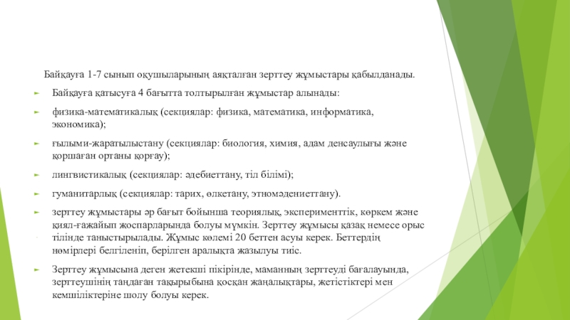 зерттеу жұмыстары әр бағыт бойынша теориялық, эксперименттік, көркем және қиял-ғажайып жоспарларында болуы мүмкін. Зерттеу жұмысы қазақ немесе орыс тілінде таныстырылады. Жұмыс көлемі 20 беттен асуы керек. Беттердің нөмірлері белгіленіп, берілген аралықта жазылуы тиіс.