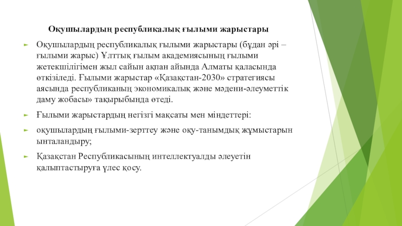 жарыстары (бұдан әрi – ғылыми жарыс) Ұлттық ғылым академиясының ғылыми жетекшілігімен жыл сайын ақпан айында Алматы қаласында өткізіледі. Ғылыми жарыстар «Қазақстан-2030» стратегиясы аясында республиканың экономикалық және мәдени-әлеуметтік даму жобасы» тақырыбында өтеді.