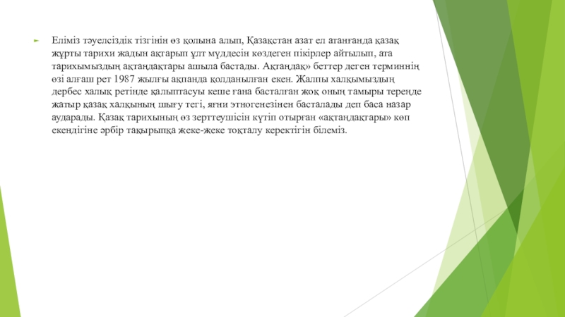 жұрты тарихи жадын ақтарып ұлт мүддесін көздеген пікірлер айтылып, ата тарихымыздың ақтаңдақтары ашыла бастады. Ақтаңдақ» беттер деген терминнің өзі алғаш рет 1987 жылғы ақпанда қолданылған екен. Жалпы халқымыздың дербес халық ретінде қалыптасуы кеше ғана басталған жоқ оның тамыры тереңде жатыр қазақ халқының шығу тегі, яғни этногенезінен басталады деп баса назар аударады. Қазақ тарихының өз зерттеушісін күтіп отырған «ақтаңдақтары» көп екендігіне әрбір тақырыпқа жеке-жеке тоқталу керектігін білеміз.