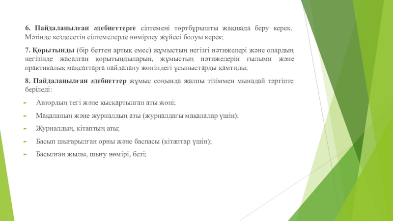 6. Пайдаланылған әдебиеттерге сілтемені төртбұрышты жақшада беру керек. Мәтінде кездесетін сілтемелерде