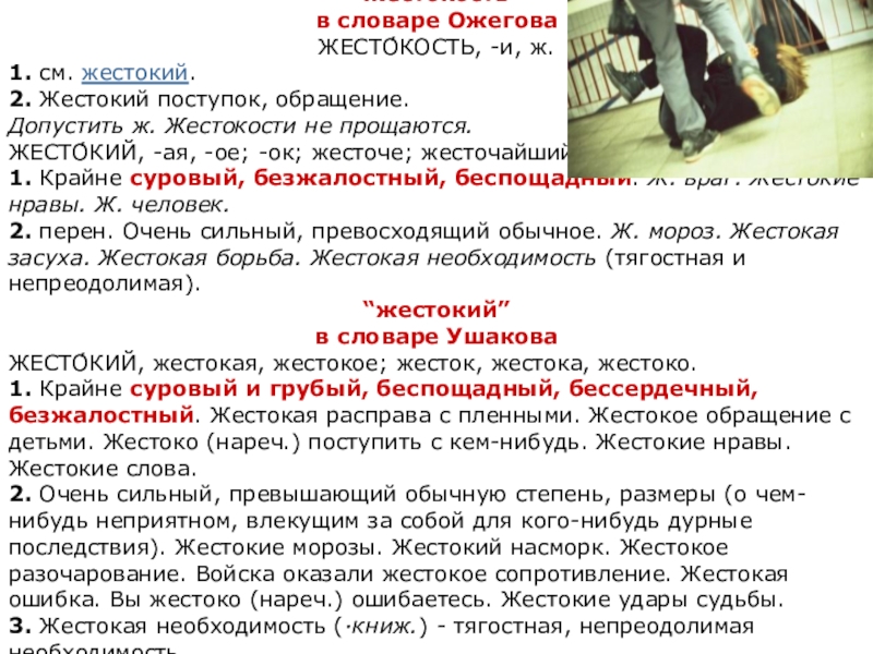 Жесто́кость — это социально-психологический феномен, выражающийся в получении удовольствия от осознанного причинения страданий живому существу неприемлемым в данной культуре способом.