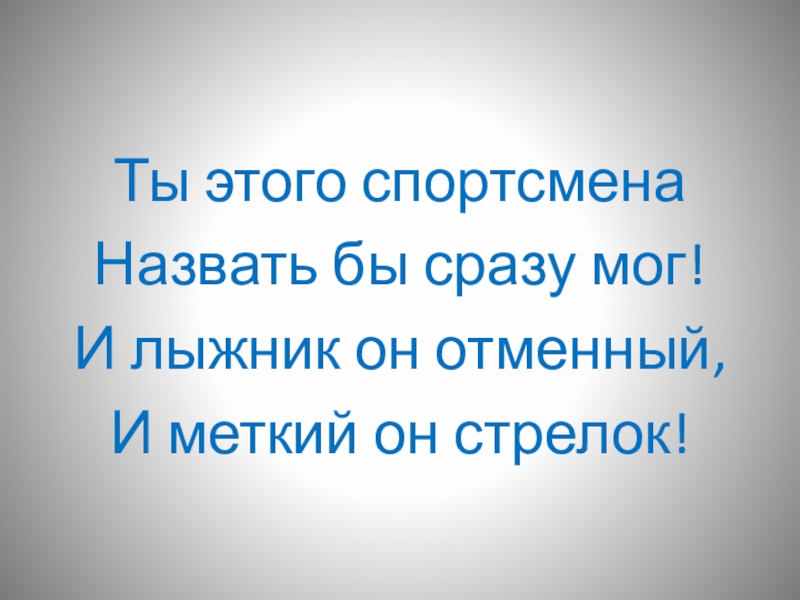 Ты этого спортсмена Назвать бы сразу мог!И лыжник он отменный,И меткий он стрелок!