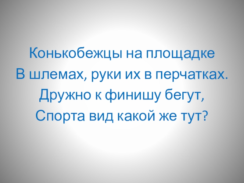 Конькобежцы на площадкеВ шлемах, руки их в перчатках.Дружно к финишу бегут,Спорта вид какой же тут?