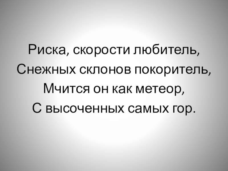 Риска, скорости любитель,Снежных склонов покоритель,Мчится он как метеор,С высоченных самых гор.