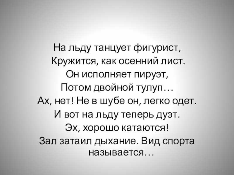 На льду танцует фигурист, Кружится, как осенний лист. Он исполняет пируэт, Потом двойной тулуп… Ах, нет! Не