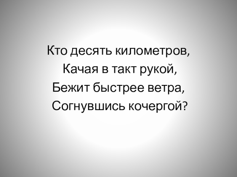 Кто десять километров, Качая в такт рукой, Бежит быстрее ветра, Согнувшись кочергой?
