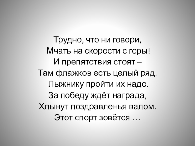 Трудно, что ни говори, Мчать на скорости с горы! И препятствия стоят – Там флажков есть целый