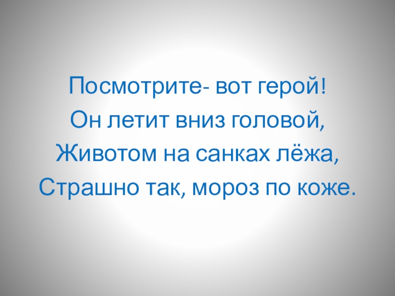 Посмотрите- вот герой!Он летит вниз головой,Животом на санках лёжа,Страшно так, мороз по коже.