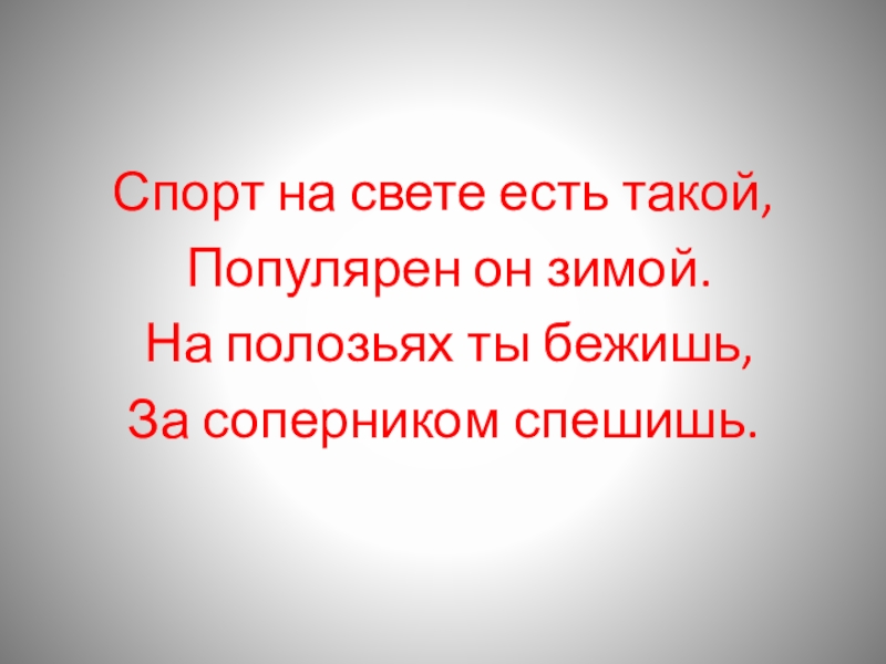 Спорт на свете есть такой, Популярен он зимой. На полозьях ты бежишь, За соперником спешишь.