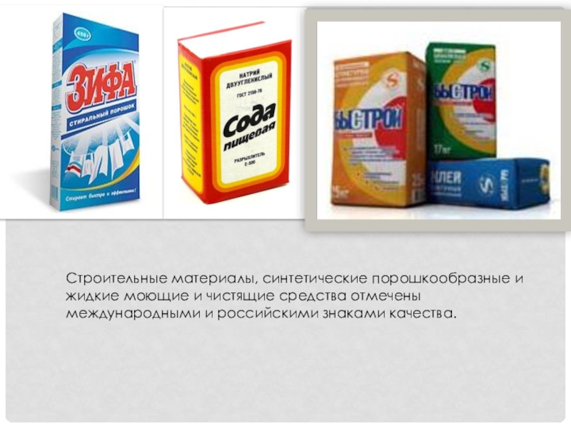 Слайд 14Строительные материалы, синтетические порошкообразные и жидкие моющие и чистящие средства отмечены