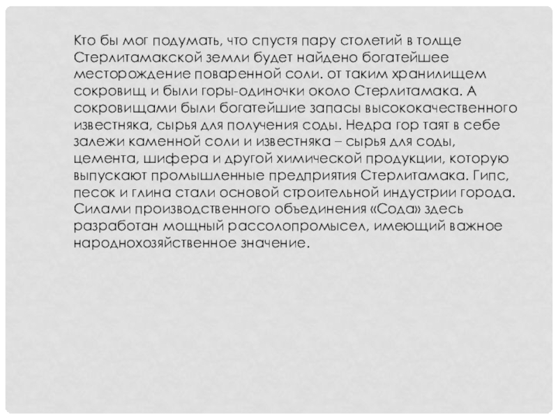 земли будет найдено богатейшее месторождение поваренной соли. от таким хранилищем сокровищ и были горы-одиночки около Стерлитамака. А сокровищами были богатейшие запасы высококачественного известняка, сырья для получения соды. Недра гор таят в себе залежи каменной соли и известняка – сырья для соды, цемента, шифера и другой химической продукции, которую выпускают промышленные предприятия Стерлитамака. Гипс, песок и глина стали основой строительной индустрии города. Силами производственного объединения «Сода» здесь разработан мощный рассолопромысел, имеющий важное народнохозяйственное значение.