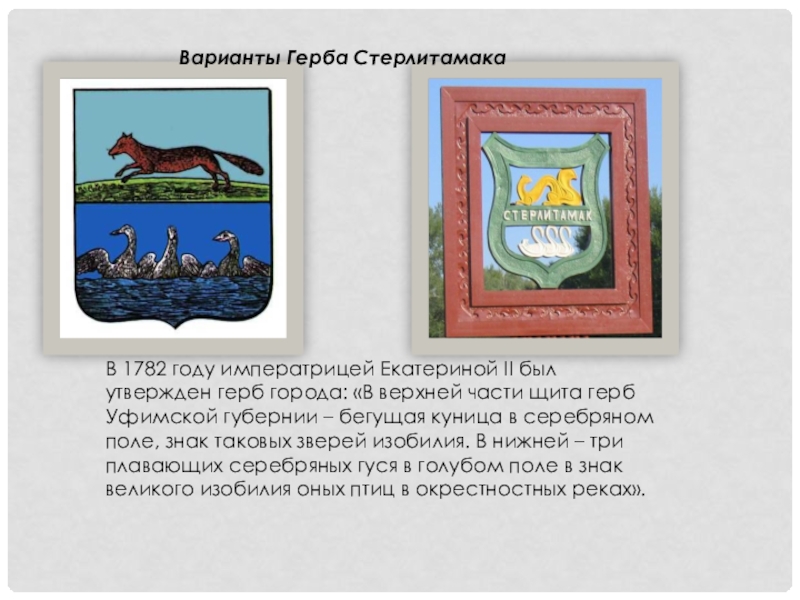 города: «В верхней части щита герб Уфимской губернии – бегущая куница в серебряном поле, знак таковых зверей изобилия. В нижней – три плавающих серебряных гуся в голубом поле в знак великого изобилия оных птиц в окрестностных реках».