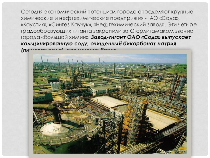 Слайд 13Сегодня экономический потенциал города определяют крупные химические и нефтехимические предприятия -