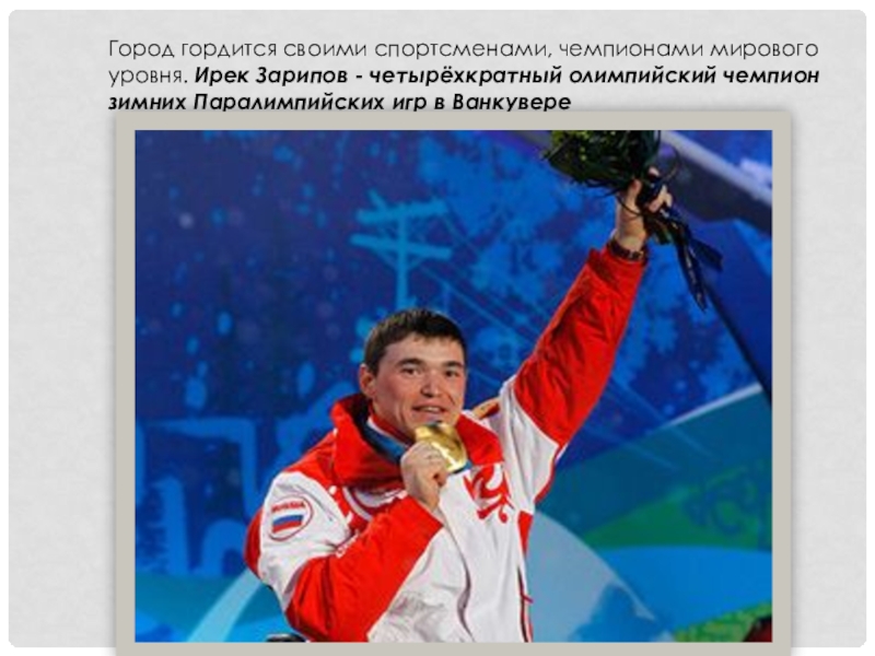 Слайд 21Город гордится своими спортсменами, чемпионами мирового уровня. Ирек Зарипов - четырёхкратный