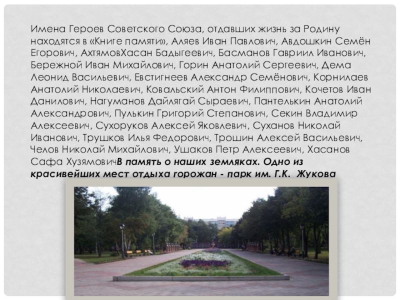 памяти», Аляев Иван Павлович, Авдошкин Семён Егорович, АхтямовХасан Бадыгеевич, Басманов Гавриил Иванович, Бережной Иван Михайлович, Горин Анатолий Сергеевич, Дема Леонид Васильевич, Евстигнеев Александр Семёнович, Корнилаев Анатолий Николаевич, Ковальский Антон Филиппович, Кочетов Иван Данилович, Нагуманов Дайлягай Сыраевич, Пантелькин Анатолий Александрович, Пулькин Григорий Степанович, Секин Владимир Алексеевич, Сухоруков Алексей Яковлевич, Суханов Николай Иванович, Трушков Илья Федорович, Трошин Алексей Васильевич, Челов Николай Михайлович, Ушаков Петр Алексеевич, Хасанов Сафа ХузямовичВ память о наших земляках. Одно из красивейших мест отдыха горожан - парк им. Г.К. Жукова